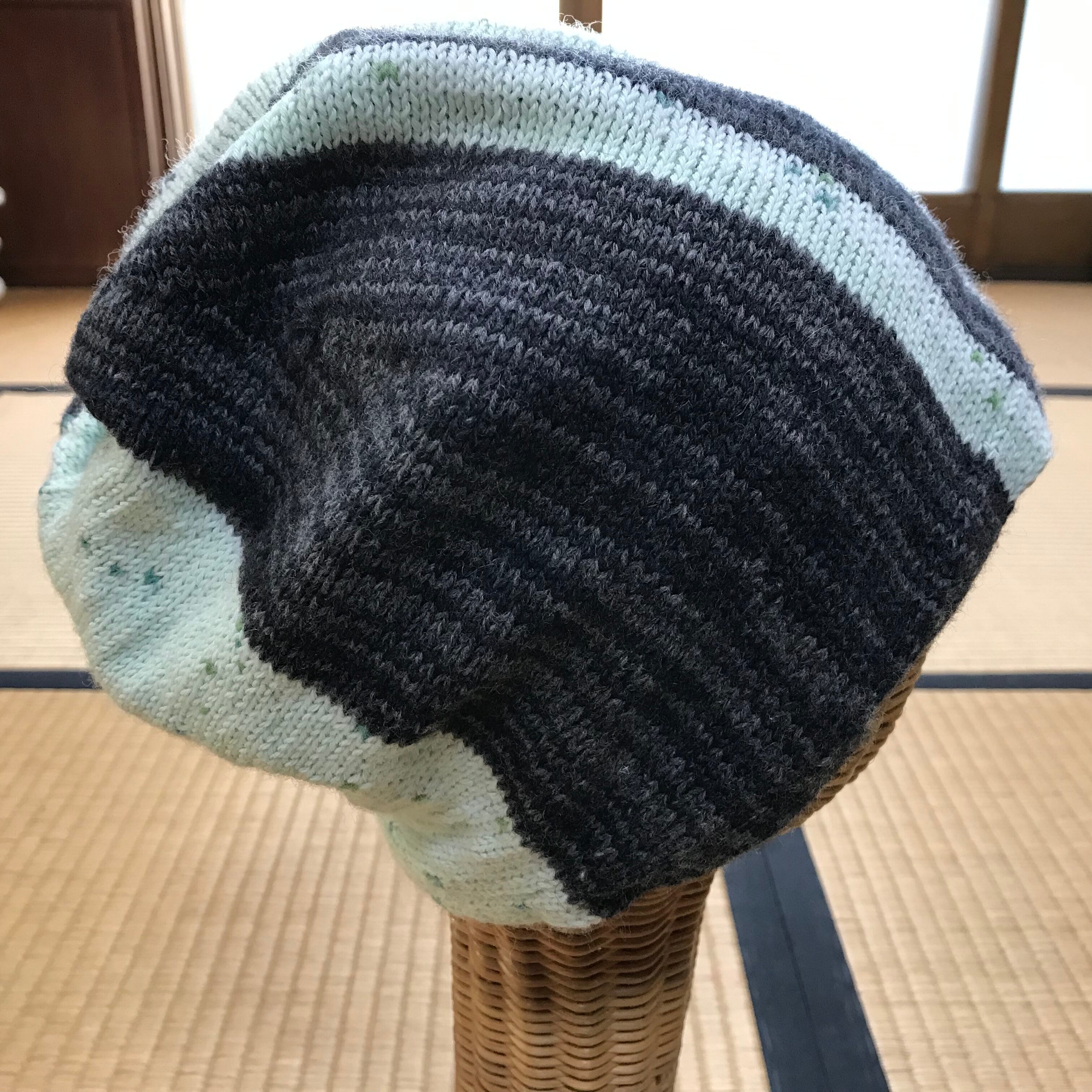 中細のウールの毛糸を使い、蓄光の糸と合わせて麻の葉模様を編み込みました。