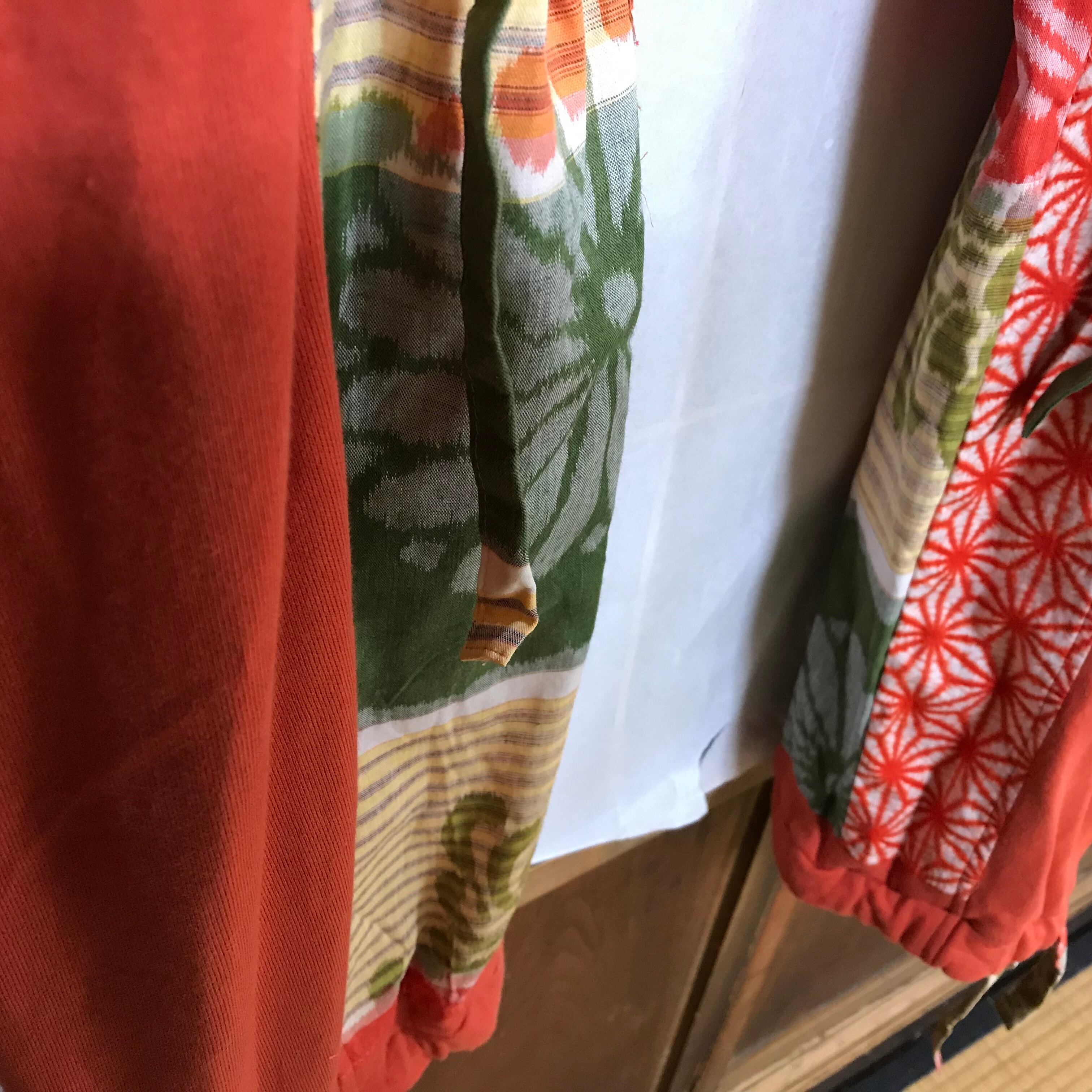 深みのあるオレンジのスウエット生地に、布団の側生地の2種類の組み合わせ。