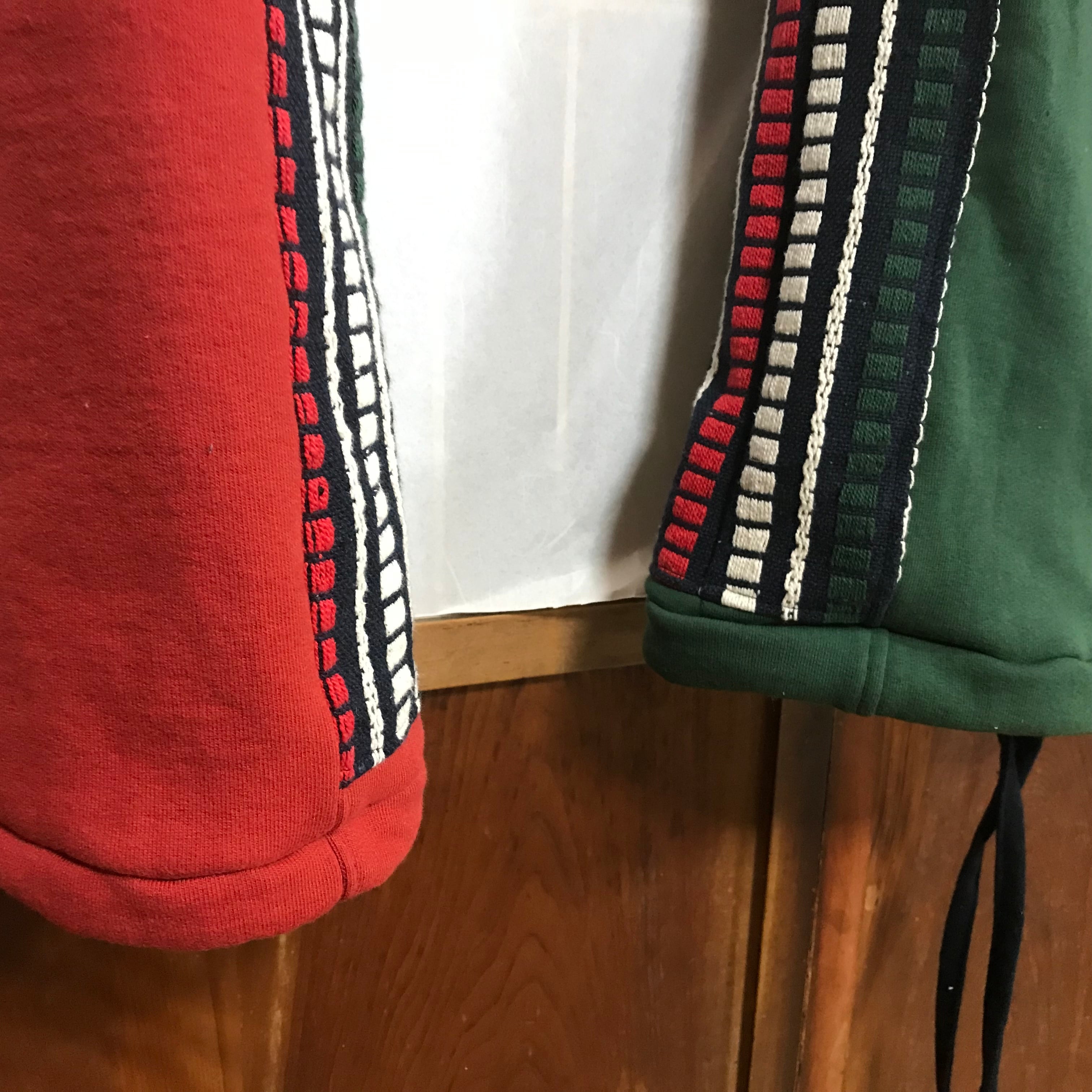 くすんだ緑と赤の厚手スウェット生地に、厚手のザックリとしたドビー生地との組み合わせ。