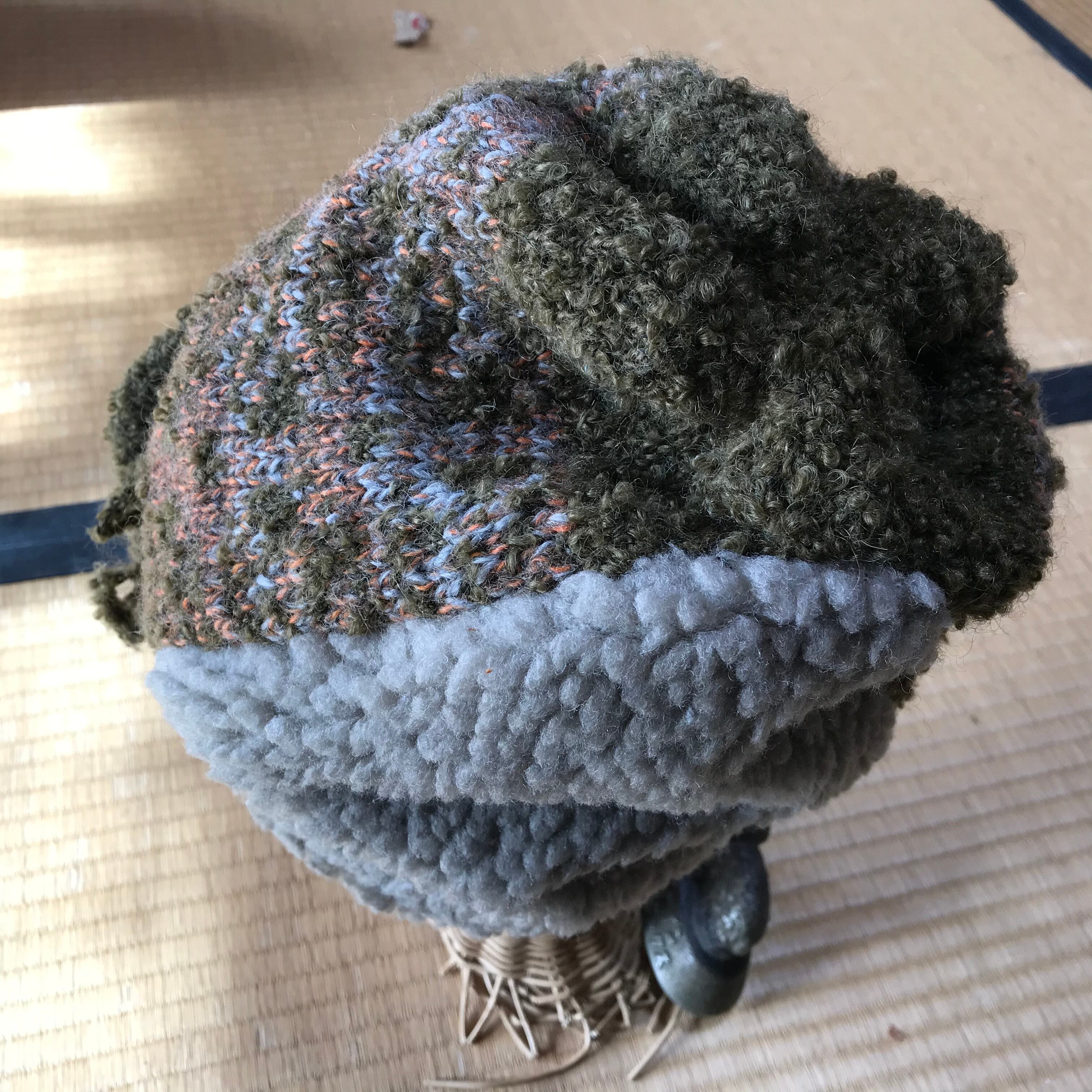 ウール100のカーキループヤーンと、茶系のミックスヤーンで麻の葉模様を編み込みしました!