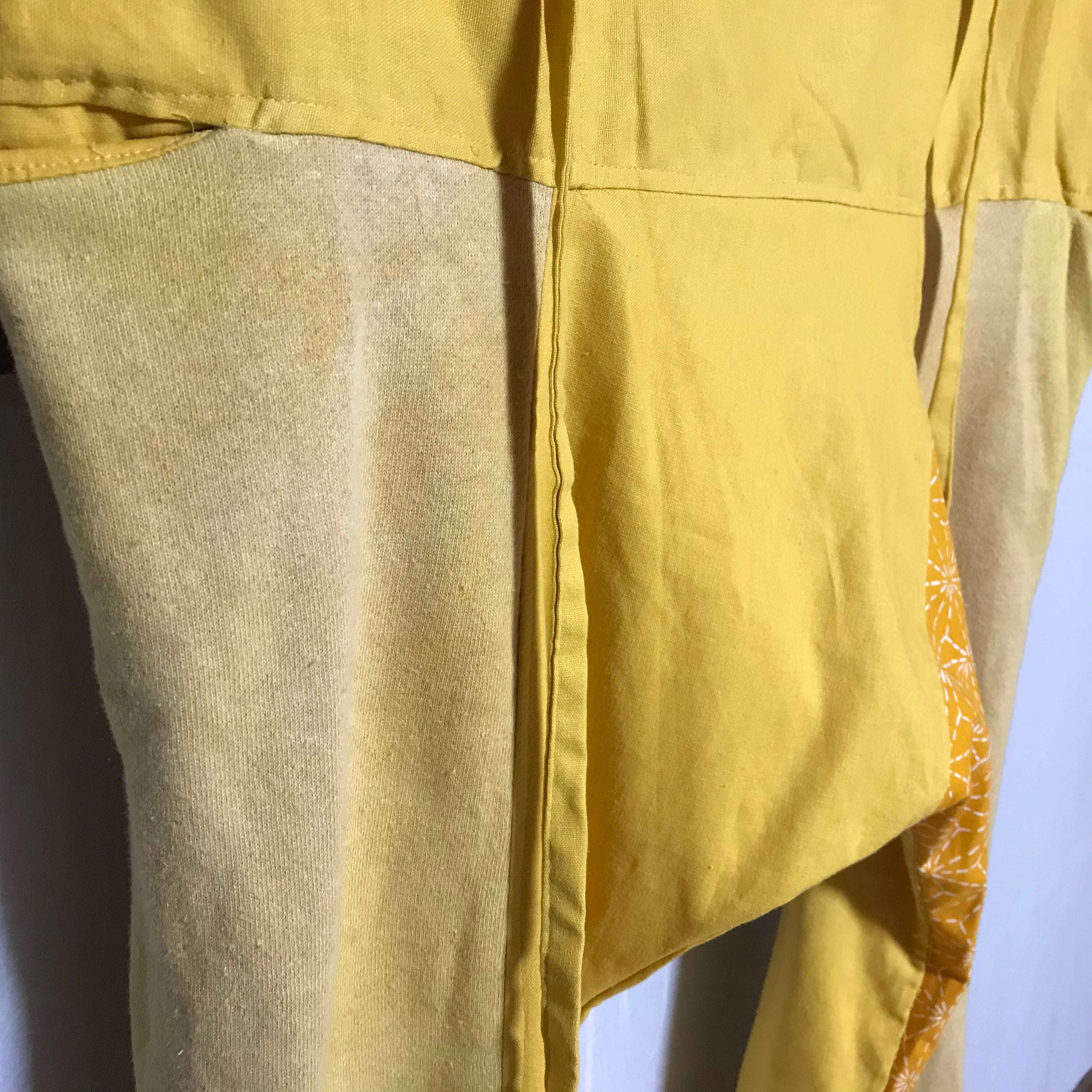 玉ねぎで染めた(ミョウバン媒染)ヘンプコットンのスウェット生地に、綿麻の生地と、麻の葉柄プリント生地を合わせました。
