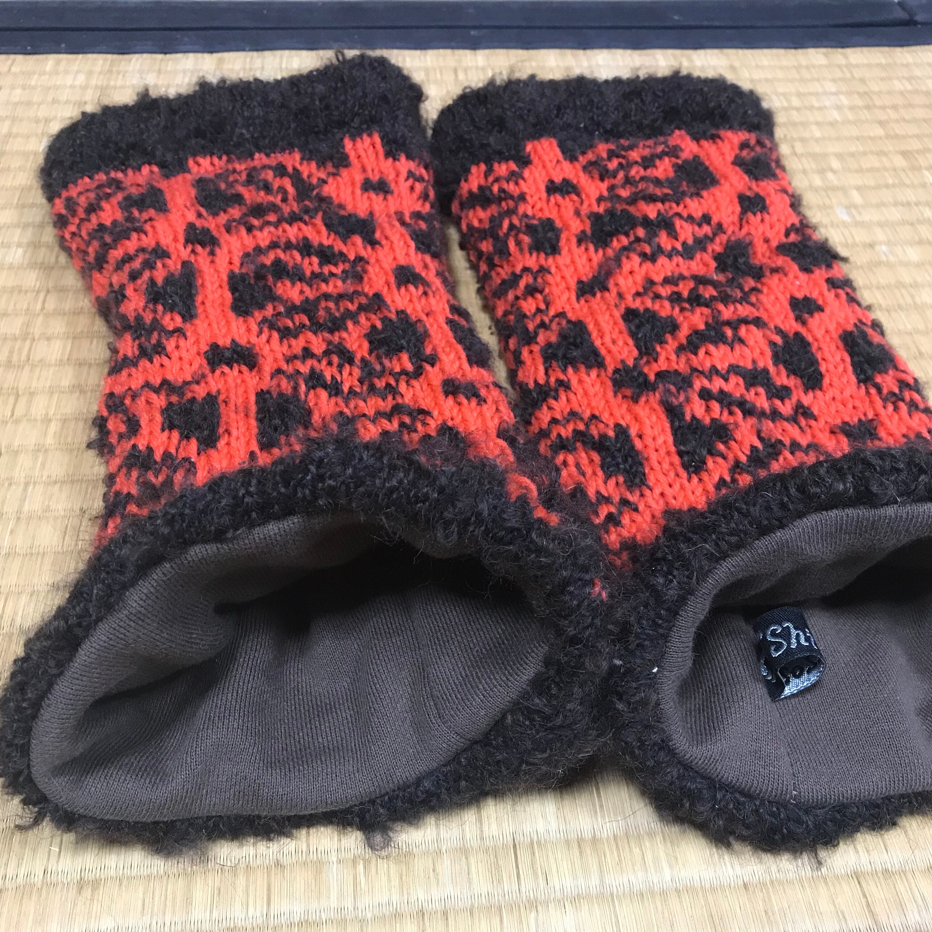 オレンジの並太の糸と、やわらかいループヤーンで編みました。