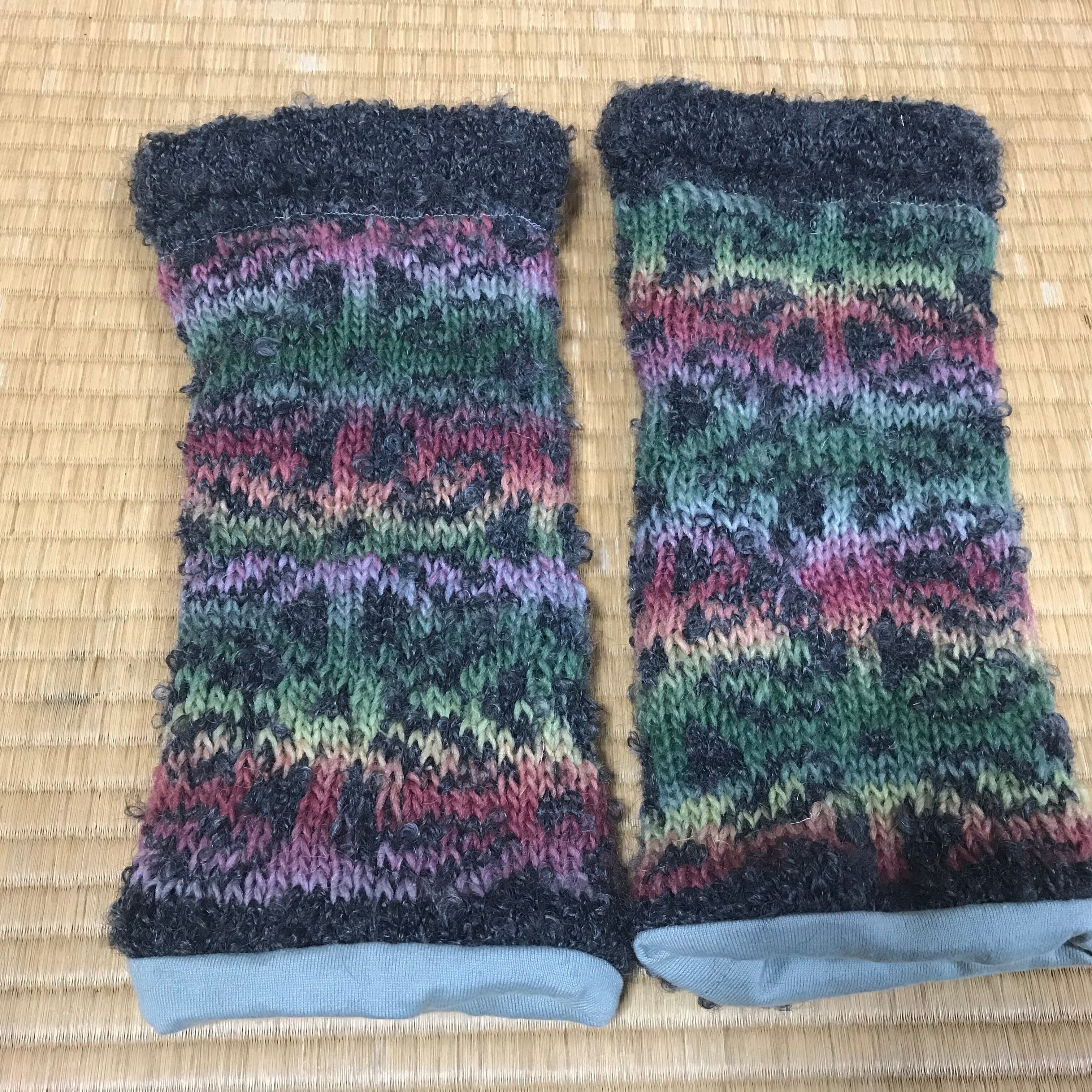 スラブヤーンの段染め糸に、やわらかいループヤーンで編みました。