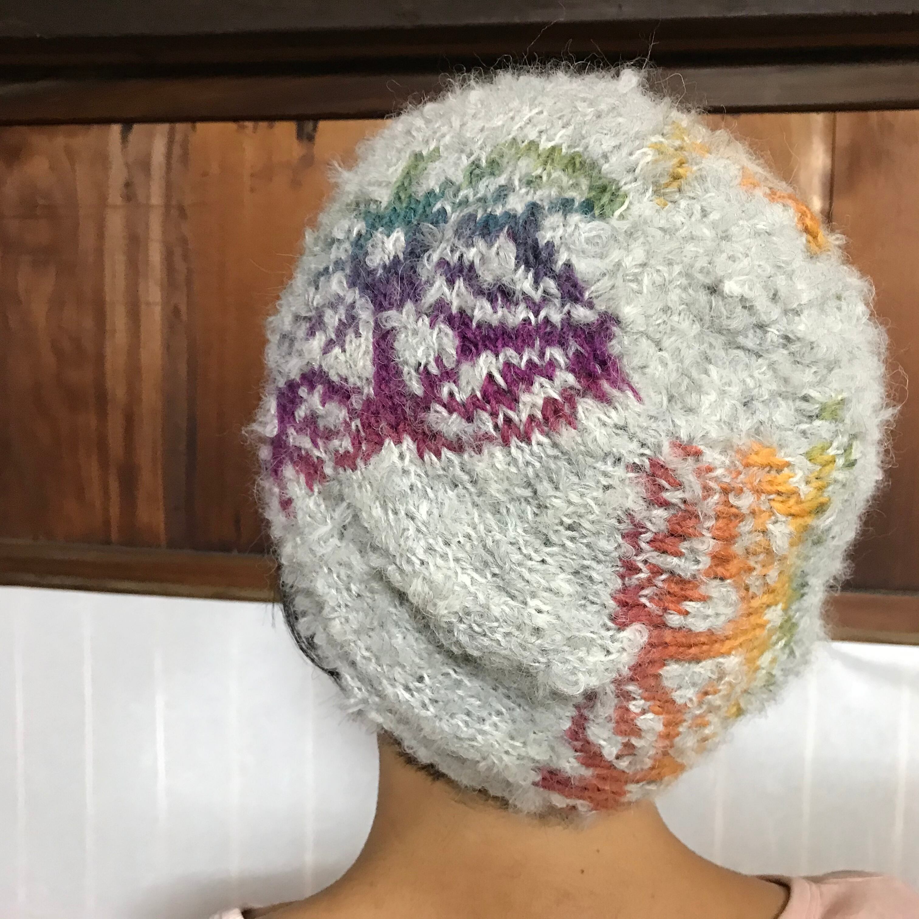 ウール100でライトグレーのモヘアループヤーンと、段染めスラブヤーンで麻の葉模様を編み込みしました!