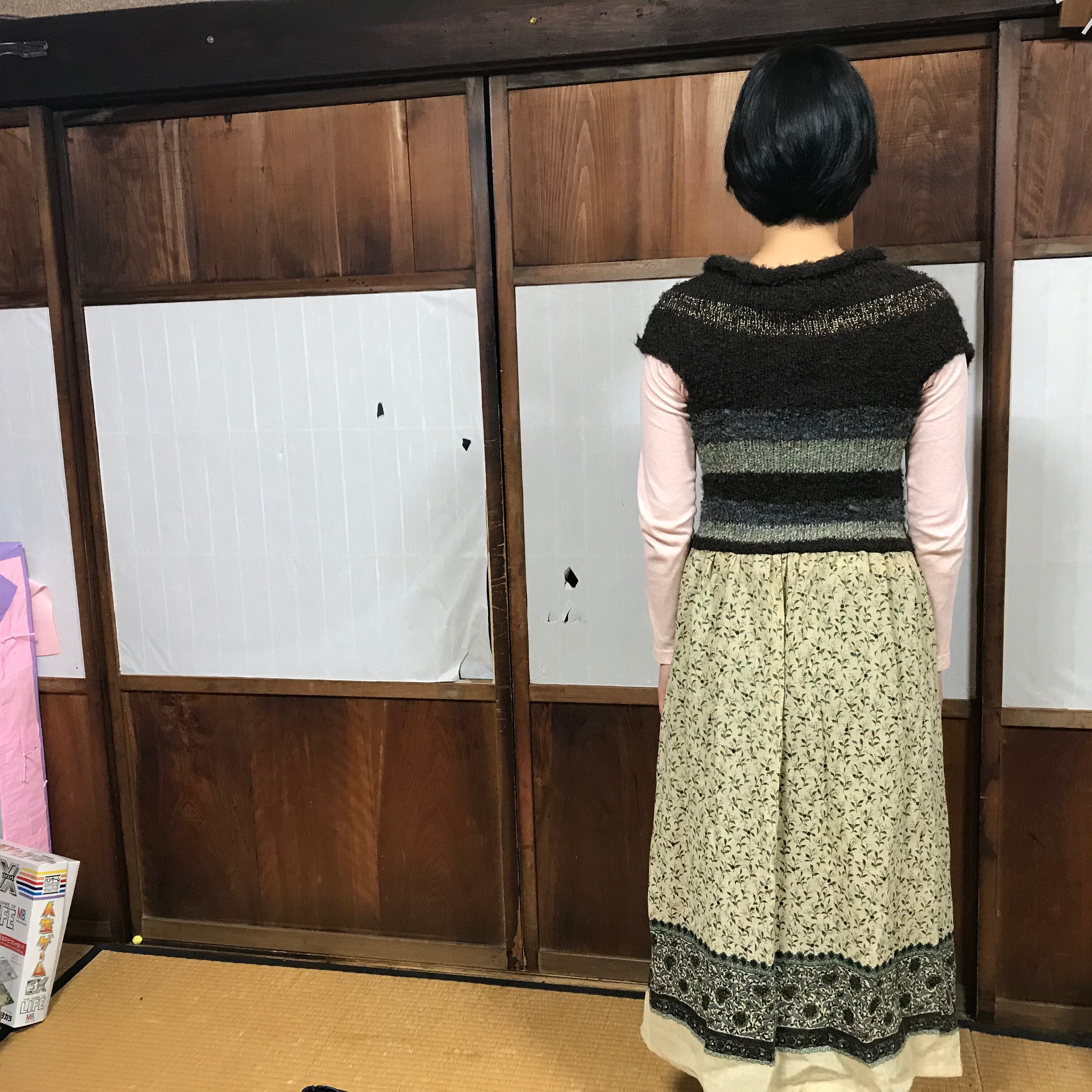 ウールのループヤーンを中心にトップスを編み上げ、化繊の混ざったウールのプリント生地を組み合わせて、ワンピースにしました⭐︎