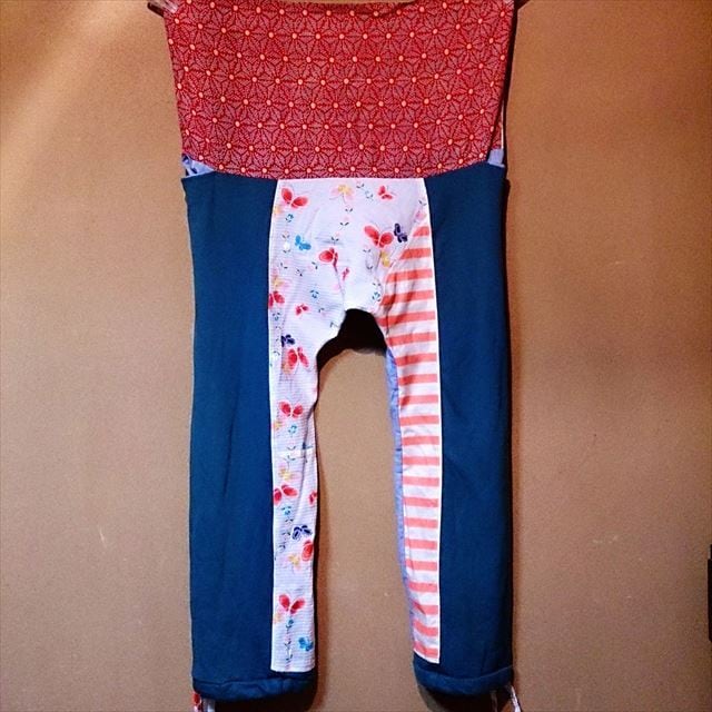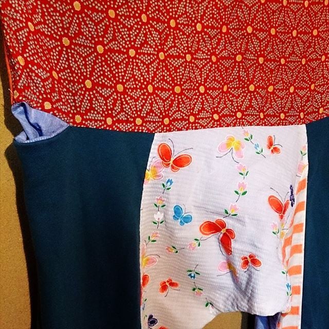 ピーコックグリーンのスウエット生地と、子供浴衣と麻の葉柄、水色のオックスフォード生地、蛍光オレンジのボーダープリント生地の組み合わせ。
