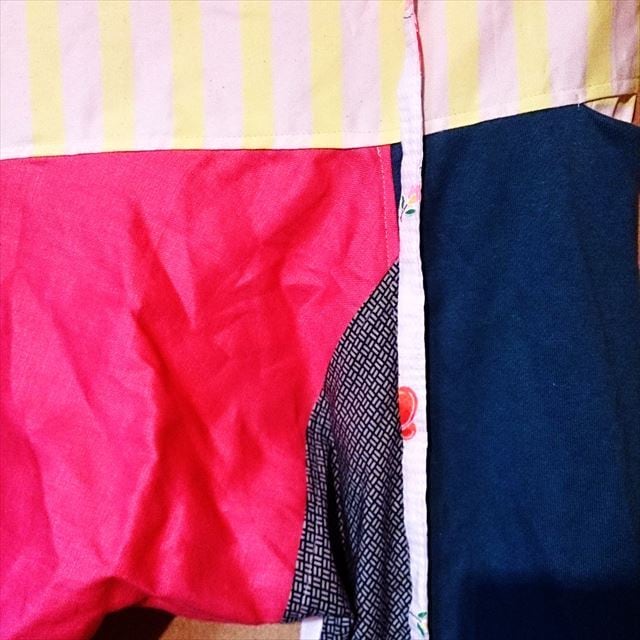 ピーコックグリーンのスウエット生地に、子供浴衣と麻の葉柄、ショッキングピンクの麻生地、和柄生地、蛍光イエローのボーダープリント生地の組み合わせ。